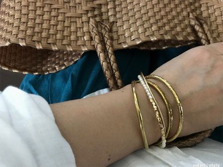 バッグ、靴、アクセサリーはゴールドでまとめました。