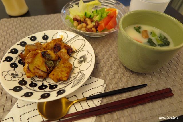 ☆豚肉と小松菜のおろしポン酢、煮物(枝豆湯葉ひろうす、大根、人参、じゃがいも、しめじ)、さつまいもソテー、☆吸い物(豆腐、にら、青ねぎ、根昆布とろろ、天かす)
