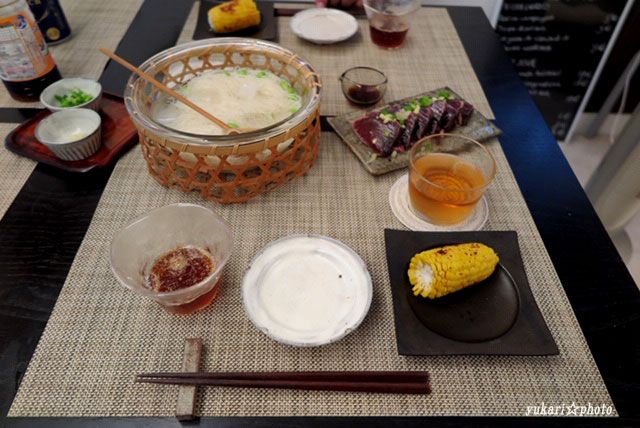 そうめん、かつおのたたき、高原とうもろこし