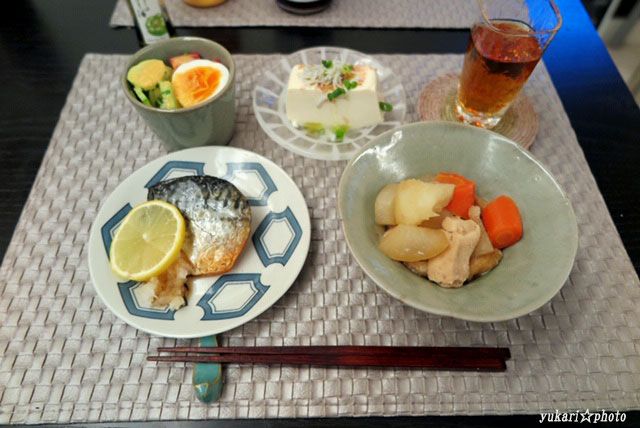 鯖の塩焼き(おろしポン酢、レモン)、煮物(鶏むね肉、油揚げ、大根、じゃがいも、人参)、☆冷奴(しらす、おかか、おろし生姜、青ねぎ、みどりのラー油)、サラダ(フリルレタス、キャベツ、きゅうり、トマト、えごま油)
