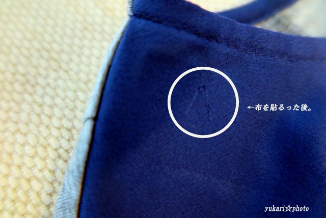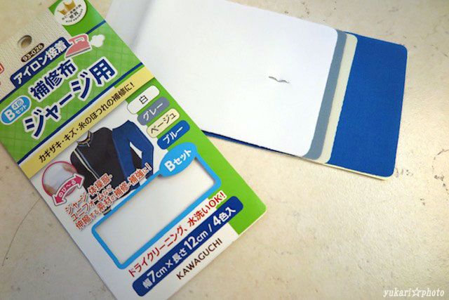 だめ元で商店街の小さな手芸屋さんに行ったら、「ジャージ用の補修布を裏からアイロンでつけたら目立たないんじゃないかな。」と勧められて買ってきました。
