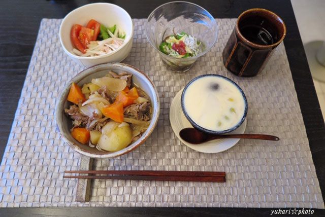 肉じゃが(牛肉、玉ねぎ、じゃがいも)、冷製茶わん蒸し(生協品)、サラダ(フリルレタス、トマト、大根、ツナマヨ)、もずく酢(もずく、おくら、しらす、梅干し、針生姜)