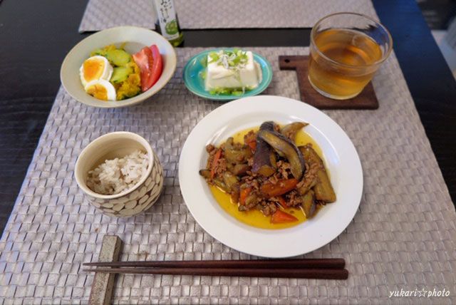 麻婆茄子(豚ミンチ、なす、人参)、冷奴(しらす、青ねぎ、みどりのラー油)、☆カボチャのサラダ(かぼちゃ、きゅうり、ハム、プルーン、トマト、ゆで玉子)、もち麦入りごはん