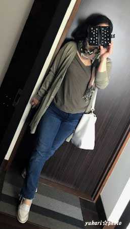 トップスはカーキでまとめて、ブルーデニムを履いて、車でスーパーまで行きました。