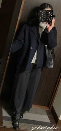 グレーのセーターにグレーのワイドパンツにアウターはネイビーで。