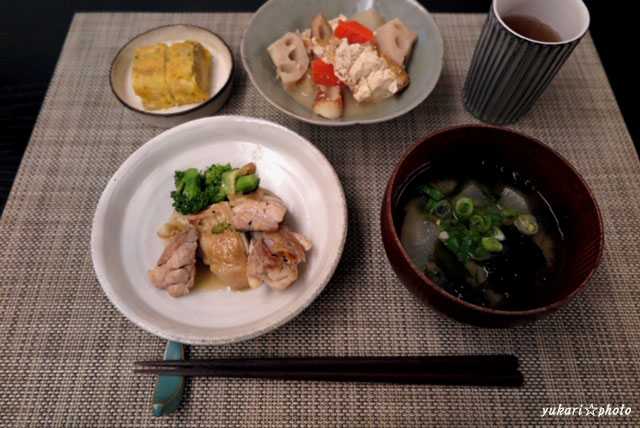 ☆鶏肉のチーズ焼き(鶏もも肉、ブロッコリー、にんにく、粉チーズ)、煮物(厚揚げ、ちくわ、大根、人参、蓮根、しめじ)、☆玉子焼き(しらす、海苔)、味噌汁(大根、わかめ、青ねぎ)