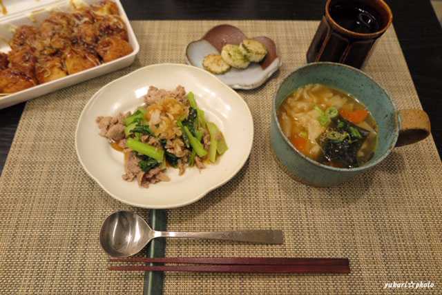 ☆豚肉と小松菜のおろしポン酢、長芋ソテー、ワンタンスープ(ワンタン、人参、わかめ、青ねぎ、白ごま、)