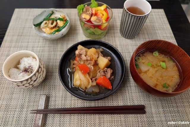 ​肉じゃが(牛肉、じゃがいも、人参、玉ねぎ)、☆にら玉(にら、ちくわ、しらす、玉子)、サラダ(レタス、カラーピーマン、葡萄)​、味噌汁(大根、青ねぎ)、ごはん(しそふりかけ)