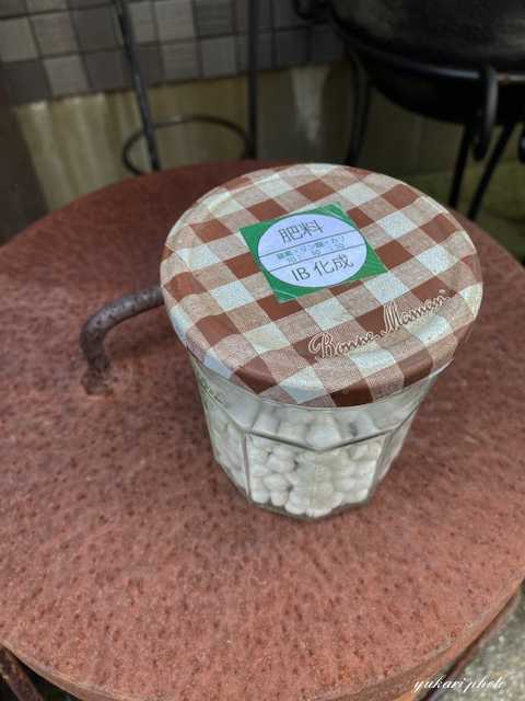 寄せ植えが届いた時に同梱されていた肥料をボンヌママンの空き瓶に移し替えて保管しています。