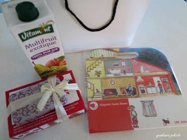 この2つのお菓子をリボンでまとめて、もう一つ​ slowworks ​さんで買った絵本も一緒に紙袋に入れて、渡しました。