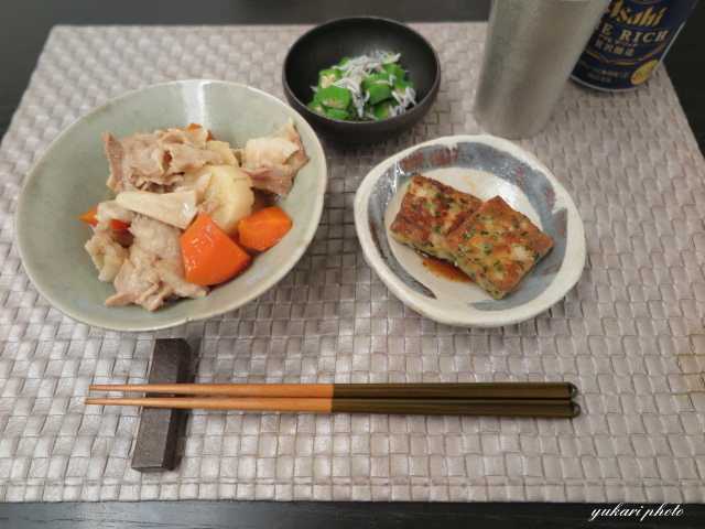 ☆豚バラ肉と里芋の煮物(豚バラ肉、里芋、人参、エリンギ)、チヂミ、おくらのお浸し