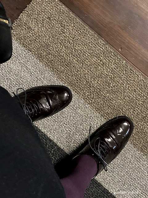 マーガレットハウエルのレースアップシューズはエナメル加工で黒のスカートにも合うかなと。