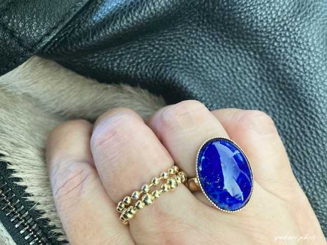 ダウンコートが青みがかあったグレーなので、リングは青い石のリングにしました。