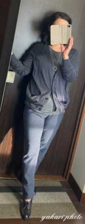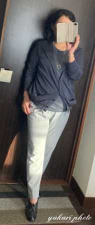 バッグと靴はそのままに、ユニクロ+Jのタンクトップとカーディガンを着て、青系の柄入りパンツを履きました。