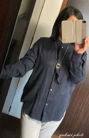 ネイビーのブラウスはフロントのボタンのところにフリルがついていて、好みのデザインです。