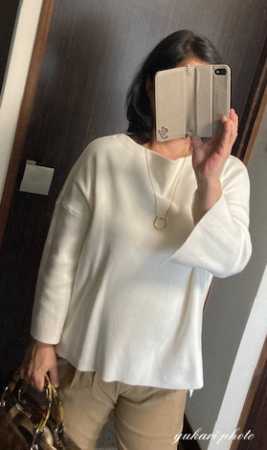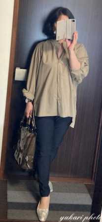 この時期にぴったりなトップスにベージュのストレッチが効いた優秀パンツを履きました。