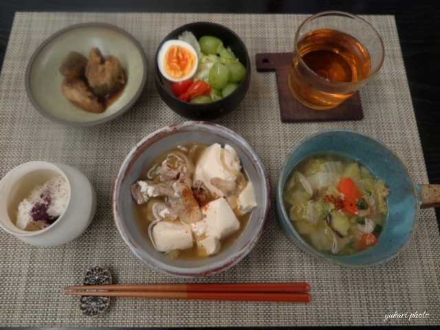 肉豆腐(豚バラ肉、玉ねぎ、豆腐、七味唐辛子)、鰺の甘酢煮(生協品)、サラダ(レタス、カラーピーマン、トマト、ぶどう、ゆで玉子)、豚汁(豚バラ肉、大根、人参、さつまいも、白菜、えりんぎ)、しそふりかけごはん