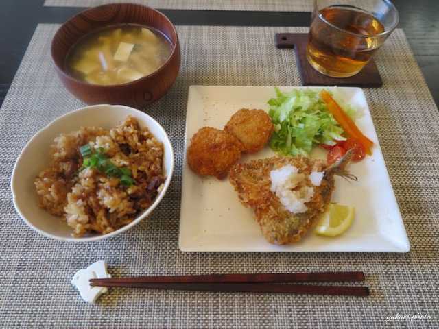 高浜とりめし、鰺フライ(おろしポン酢で)、ホタテフライ(抹茶ソルトで)、レタス&カラーピーマン&トマト、味噌汁(豆腐、油揚げ、青ねぎ)