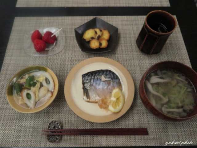 鯖の塩焼きおろしポン酢で、☆ちくわとおくらの玉子とじ、さつまいもソテー、吸い物(ふしめん、しめじ、天かす、根昆布とろろ)、苺