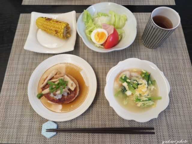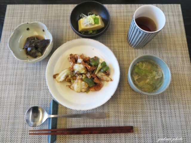 回鍋肉(豚肉、キャベツ、ピーマン、青ねぎ)、☆なすの煮びたし、玉子豆腐(おろし生姜、しらす、青ねぎ)、中華スープ(レタス、玉子、白ごま)