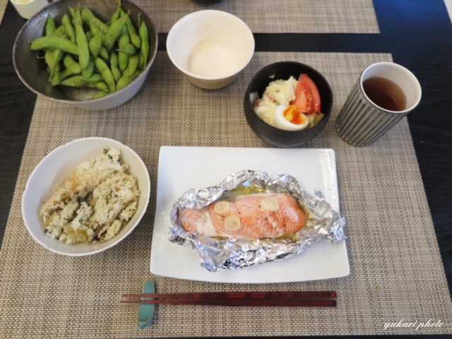 ☆鮭のガーリックバター蒸し(鮭、玉ねぎ、にんにく、バター)、ポテトサラダ&トマト&ゆで玉子、枝豆、高菜としらすの炊き込みご飯(OISIX)