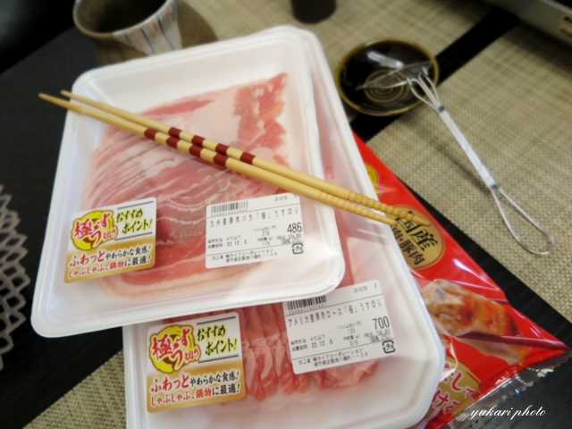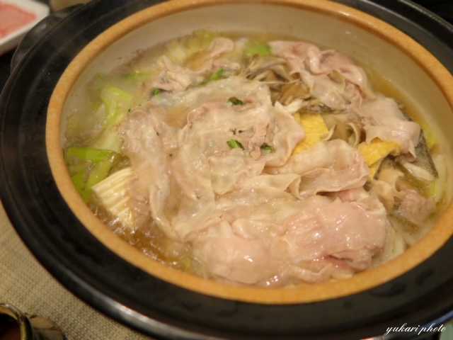 豚肉、鶏もも肉、生たら、餃子、白菜、長ねぎ、豆苗、舞茸、油揚げ、豆腐、春雨です。
