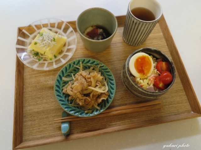 ☆豚肉と玉ねぎ炒め、玉子豆腐(しらす、おろし生姜、青ねぎ)、もずく酢(山芋とろろ、梅干し)、サラダ(マカロニ、ハム、ミックスベジタブル、トマト、ゆで玉子)