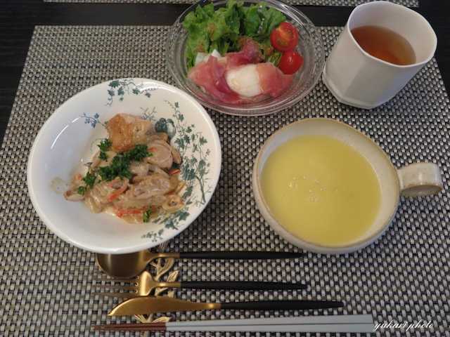 鶏肉のクリーム煮(鶏もも肉、玉ねぎ、人参、パセリ)、サラダ(グリーンリーフ、生ハム、モッツアレラチーズ)、コーンスープキヌア入り