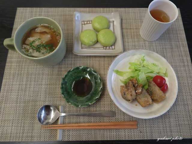 鰺の甘酢煮(生協品)、レタス&トマト、ほうれん草の餃子(OISIX)、ワンタンスープ(ワンタン、にら、長ねぎ、白ごま)