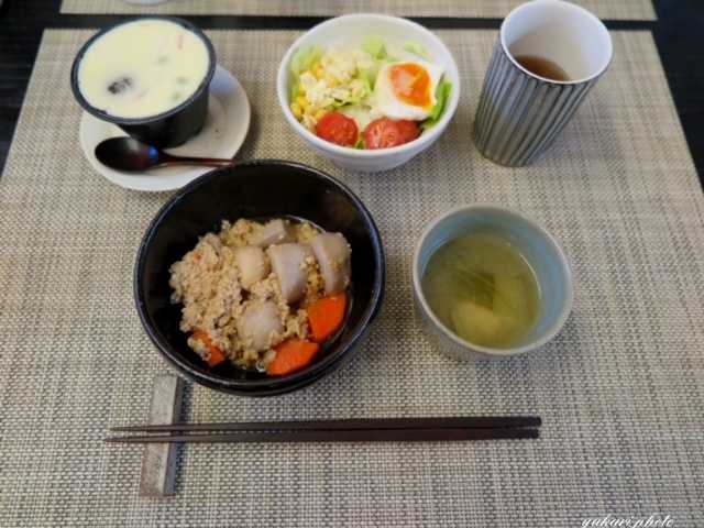 煮物(鶏ひき肉、里芋、人参)、サラダ(レタス、マカロニ、スイートコーン、トマト、ゆで玉子)、茶わん蒸し、味噌汁(青梗菜、えのきだけ)