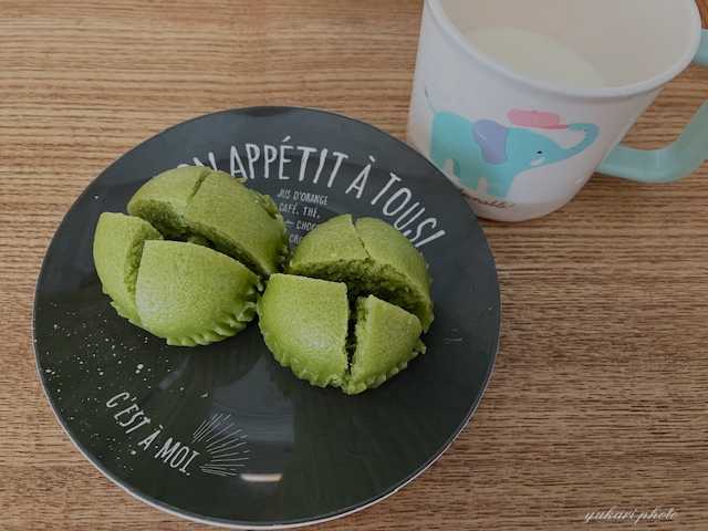 ほうれん草の蒸しパンは、牛乳と共におやつに出しました。