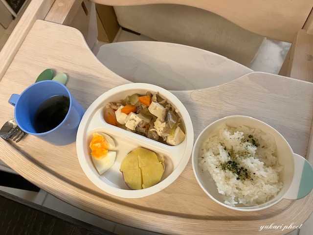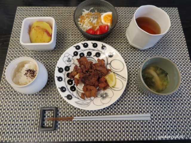 豚肉の唐揚げ、サラダ(キャベツ、トマト、ゆで玉子)、さつまいものレモン煮、味噌汁(しめじ、わかめ、ねぎ)です。