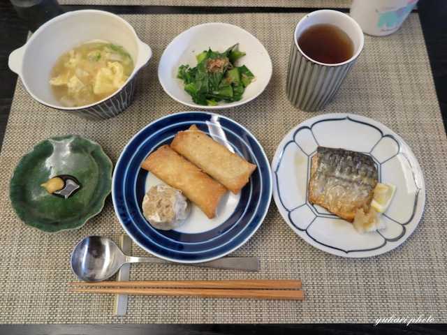 春巻(蓬莱)、焼売、鯖の塩焼き、小松菜としらすのお浸し、中華スープ(エリンギ、玉子、ねぎ)です。