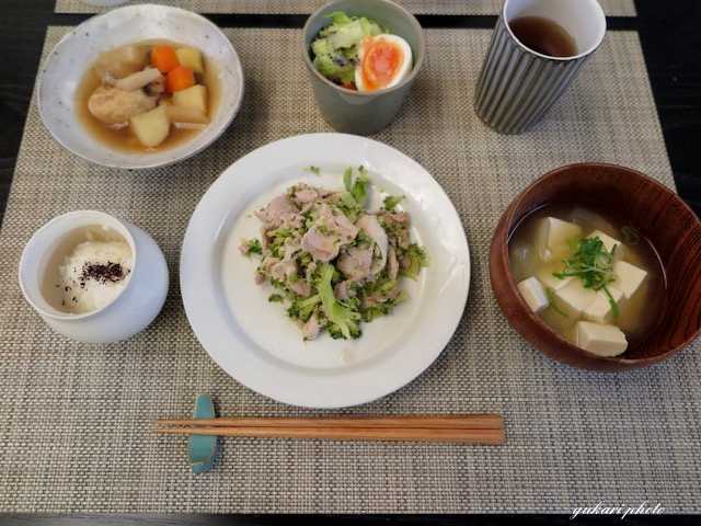豚肉とブロッコリーのウェイパー炒め、煮物(枝豆湯葉ひろうす、大根、じゃがいも、人参)、味噌汁(豆腐、玉ねぎ、ねぎ)、ふりかけごはんです。