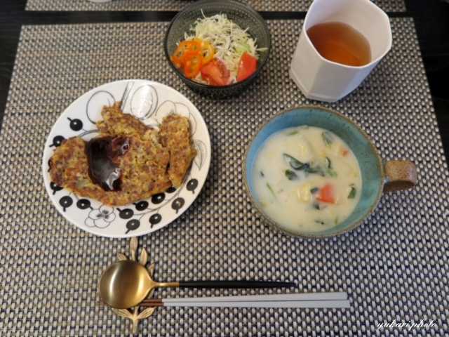 オムハンバーグ(合いびきミンチ、玉ねぎ、玉子)、ホワイトチシュー(鶏むね肉、玉ねぎ、じゃがいも、人参、ほうれん草)、サラダ(キャベツ、カラーピーマン、トマト、黒胡麻)