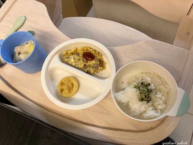 オムハンバーグ(合いびきミンチ、玉ねぎ、玉子)、アンパンマンさつまいも、ホワイトチシュー(鶏むね肉、玉ねぎ、じゃがいも、人参、ほうれん草)、ふりかけごはんです。