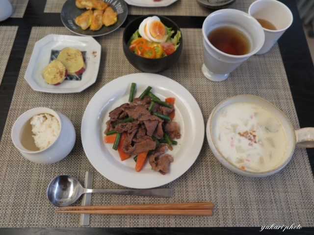 ☆牛肉とにんにくの芽と人参炒め、サラダ(レタス、カラーピーマン、トマト、ゆで玉子)、☆さつまいものレモン煮、彩り野菜のチキンクラムチャウダー(kit OISIX)です。