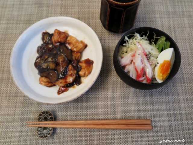 鶏肉と茄子のみそ炒め(鶏むね肉、なす)、サラダ(フリルレタス、キャベツ、かにかま、ゆで玉子)