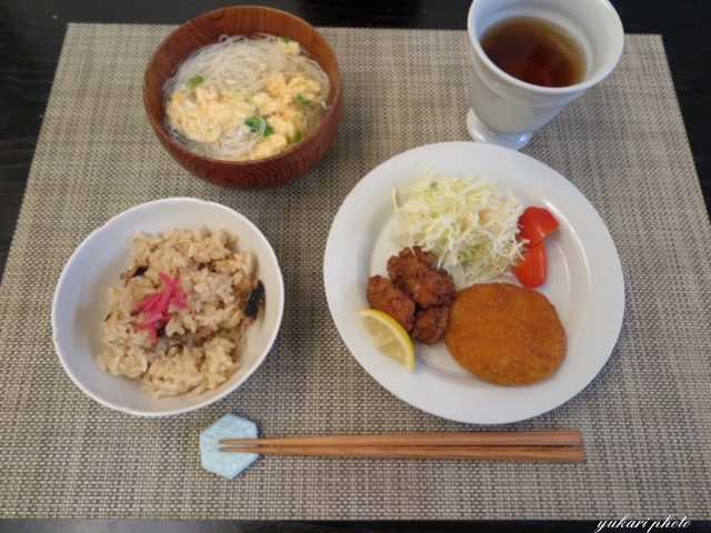 秋刀魚ごはん(OISIX)、カニクリームコロッケ&たこの唐揚げ(お惣菜)、キャベツ&トマト、☆にゅうめん(素麺、かいわれ菜、玉子)
