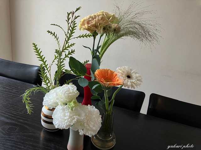 毎回のことですが、届いたお花は玄関用、おトイレ用、お仏壇用の花器に分けて、活けます。