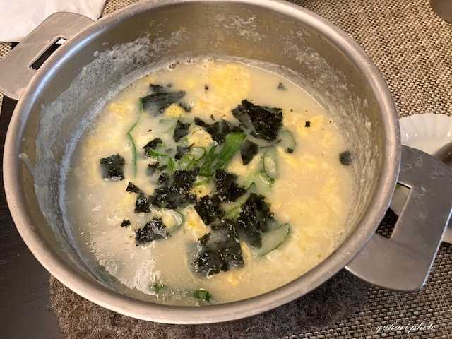 そしてそれでも残った出汁がやっぱりもったいないということでご飯を入れて煮込み、玉子と青ねぎとのりをのせて、雑炊を作りました。