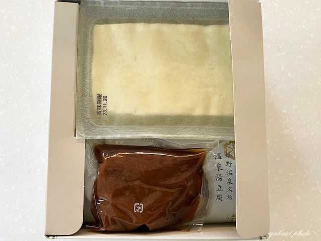 湯豆腐の箱の中にはお豆腐と調理水と胡麻だれが入っています。