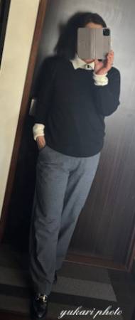 グレーに白い襟&白い袖のセーターに千鳥格子のパンツを履いて、ネイビーのアウターを着ました。