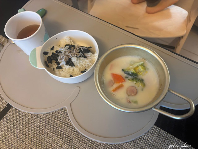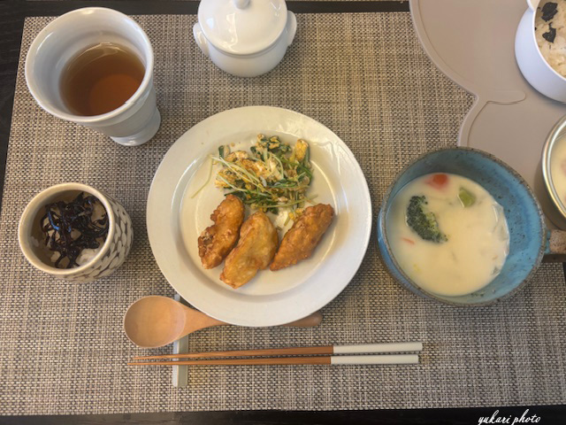鶏の天ぷら、豆苗と玉子の炒め物、クリームチシュー、ごはん、きくらげの佃煮