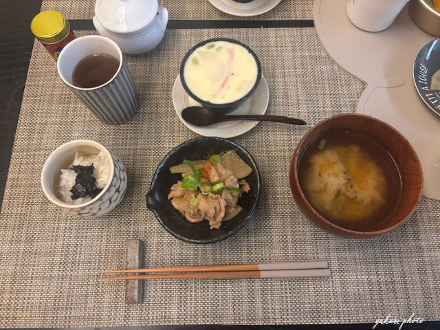 豚肉と大根の煮物、茶わん蒸し、味噌汁(具忘れ)、ごはん、昆布の佃煮