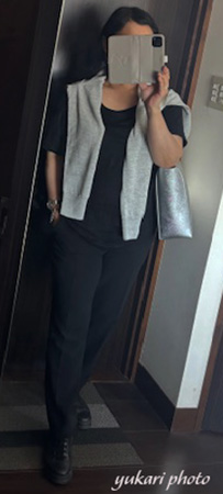 ブラックのTシャツ&パンツの上にリネンのグレーのカーディガンを羽織って。