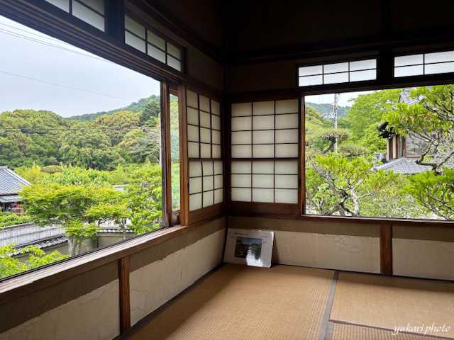 2階の客間から窓の外を眺めると新緑がまぶしくてきれいでした。