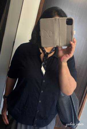ネイビーのニットカーディガンにグレーのユニクロのパンツを履いて。
