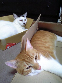 仕事で使った段ボールに入る、みかん&まりん。まりんの右目はまだちょっと赤い。段々良くなってるんだけど…でも、あと2~3回(いや、もっとか?)薬を塗らなきゃダメそうだよ。まりこ姫。薬、すごく嫌がるんだよね~でもナゼだか、おかあタンのことはキライにならず(ホッ)まりんなりに、おかあタンが良かれとやっているのは分かってるのかも。ありがとうね、いい子ね、まりん。