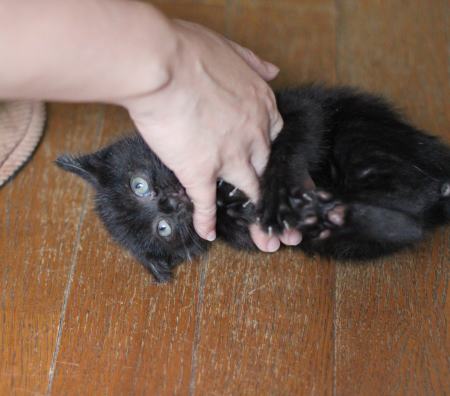 おとうタン生誕●周年記念(誕生日とも言う)&みかん・まりん2歳誕生日(推定)の前日。おとうタンと買い物に出て歩いて帰ってきて、もう家に着く。と言うその時。黒い仔猫が我が家の横から道路に踊り出てきた(本当に踊るように出てきた)走ってる自転車の目の前に。幸い自転車はゆっくり走ってたので轢かれないで済んだが自転車の女性は相当ビックリしたようで動転してた。近くに母猫とおぼしきサビ猫が心配そうに見ている。近所でご飯をもらってるサビ猫で、この辺のサビ猫の中ではうちのサビに一番似てる。母猫がいるなら返そうと思ったんだけど仔猫は目ヤニがひどく、完全に目が塞がって見えていない状態。でも意外と元気でデタラメに歩き回ろうとする。これじゃ、母猫に返しても翌日までに絶対車に轢かれる。もっと裏路地にいて、ちょうど仔猫を連れて引っ越して来たとこだったんだろう。母猫も自分の手におえないのが分かってるのか鳴きもしないで、ただすがるようにこっちを見てる。ブレてるけど、黄色く見えてるのは目じゃなくて目ヤニ。猫の保護に関しては色々難しくて全部の猫たちが幸せになればいいと思うのに現実は厳しくて残酷で辛くて・・・可愛そうな猫を片っ端から保護するわけにも行かない。どこかに限界がある。うちも全然性格の違う5ニャンで手一杯になりつつあってもう1ニャン増やすと今いるニャンズに負担をかけてしまう。新しく飼い主さんを探すって言ったってそう簡単じゃない。ネットで飼い主さんを募集してる猫ちゃんはいっぱいいっぱいいる。迷ったけど、家の前だし、サビちゃん似のサビ猫の頼み(?)だし…保護を決意。しかし、目は開かないし鼻も詰まってる。大丈夫かい?温めた牛乳少量をお皿に入れて口元に運んだけど飲まない。えぇ?哺乳瓶じゃないとダメとか??病院に連れて行こうと思ったら、その日は一般的に夏休みの最終日で動物病院は休み。でも病院に預かりの子がいれば、夕方にご飯をあげに先生が来るだろうからとりあえず電話してみる(いるときもありますから電話してみてって以前から言われてた)電話したら、やっぱり先生がいて「今からシャンプーする子がいるからしばらくいます~」との事。大急ぎで連れて行って診てもらう。「あらぁ、猫風邪ね~。目ヤニがすごいわね~。洗っちゃおうか」ってことでイキナリ洗われちゃう仔猫(苦笑)ドライヤーでよ~く乾かしてもらう。洗ったら目が開いたけど目の周りが腫れてて半開き。なんか目は開いたけど焦点も合ってなくて見えてるのか不安。大丈夫なのか~??目薬と飲み薬をもらう。お皿から牛乳を飲まなかったので、とりあえずシリンジで猫ミルクをあげることに。猫用粉ミルクを買う。しっかし、みかん&まりんを保護した時と同じくらいの大きさだけど、ミルクなの~?みかん&まりんはうちに来る前、思いっきり大人ご飯食べてたけどなぁ。疑問は膨らむ。どっちにしても離乳の時期だろうし、仔猫用のご飯も買う。仔猫用ご飯をお皿に入れてあげたけどよく分かってない様子。シリンジで猫用ミルクをあげたら飲むんだけど量が少ない。ちょっと無理やり多めに飲ませる。なんだか目の周りは真っ赤に腫れてるし、飲む量も少ないし、色々大丈夫なのか~?↓ポチッとしてニャ